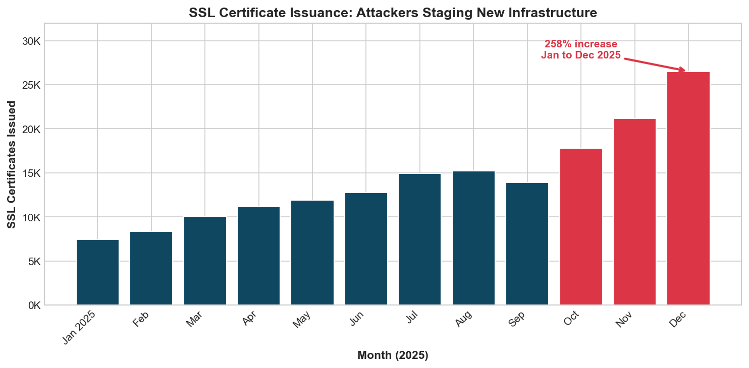 Why SSL Certificates Matter: Modern phishing attacks require SSL certificates to appear legitimate. A surge in certificate issuance signals attackers preparing infrastructure.