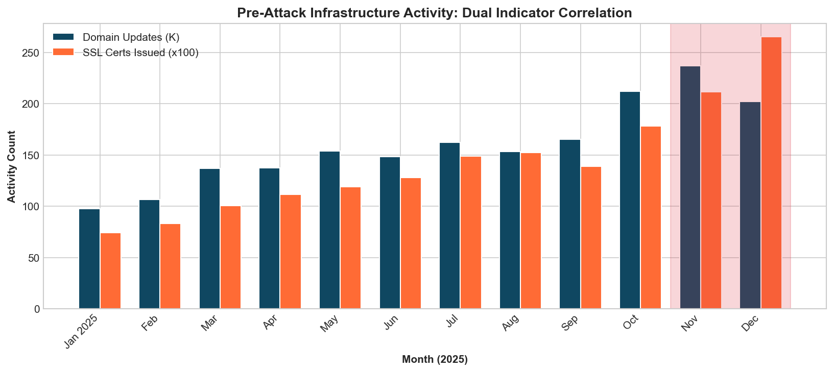 - October-November 2025: Domain activity peaked at 236,973 updates, certificates reached 21,149.