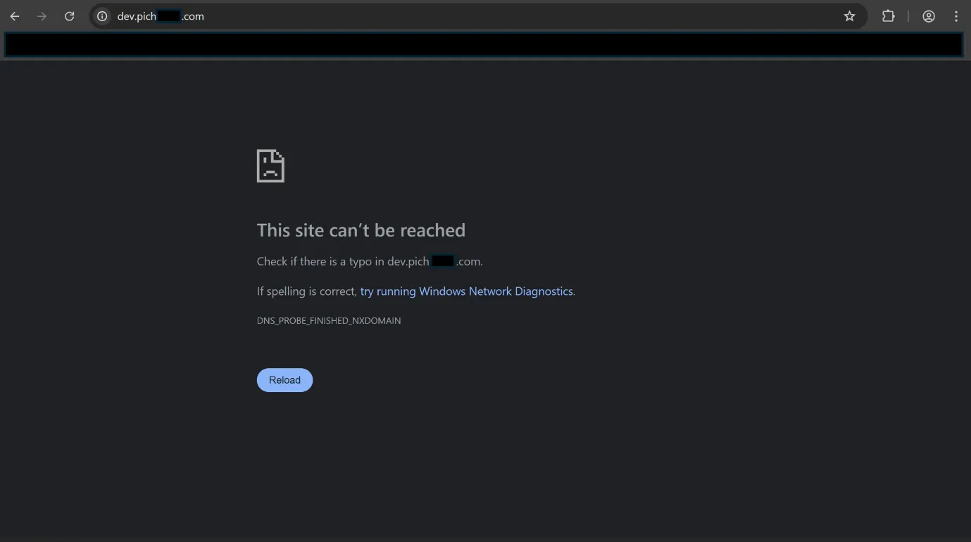 The user tries to visit dev.pitch*****.com, but subdomain does not exist.
