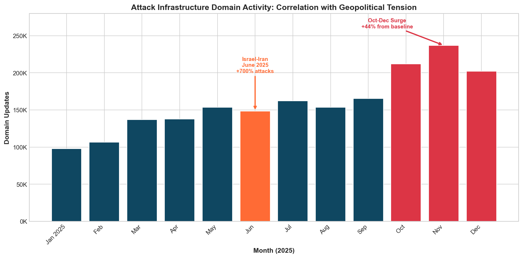 The data supports our hypothesis: attack infrastructure activity correlates with geopolitical tension. Throughout 2025:
