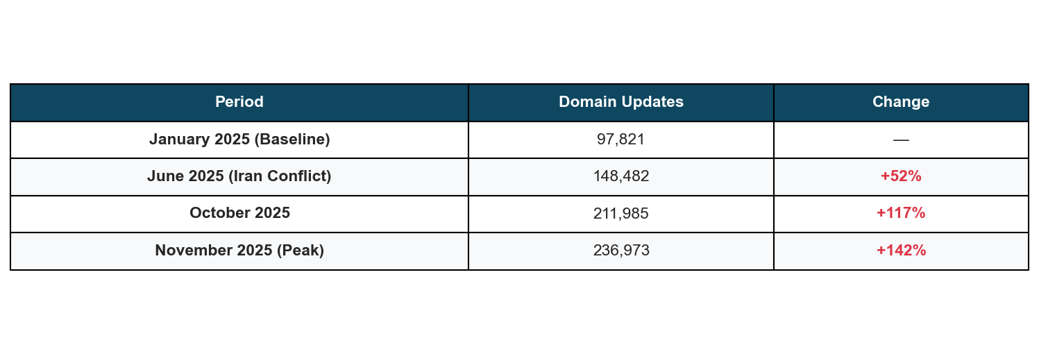 Key Finding: Domain update activity increased from 97,821 in January 2025 to 236,973 in November 2025, a 142% increase correlating with Israel-Iran tension.