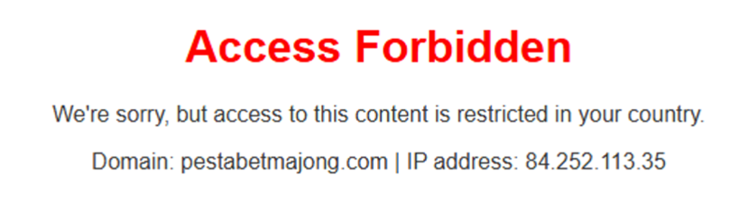 These domains are geolocation-sensitive, as in some cases they only allow access to the website from IP addresses in specific countries, for instance Indonesia. Below you can see our failed attempt to access the website from an IP address with Mexican geolocation, as opposed to a successful attempt from an IP address with Indonesian geolocation.